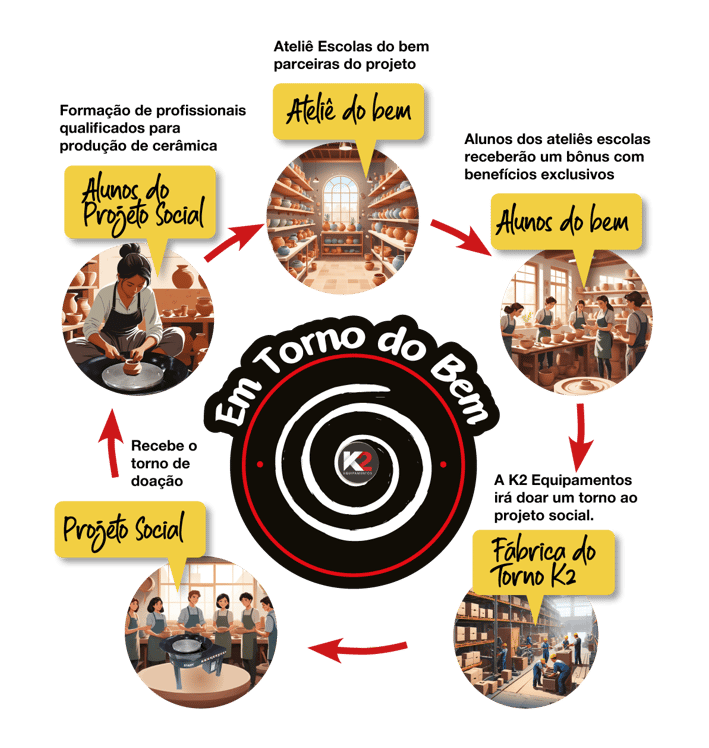 Ao adquirir um torno K2 através do projeto, Em Torno do Bem, os alunos dos ateliês do bem, estarão contribuindo para a doação de um torno a um projeto social, além de receberem benefícios exclusivos.